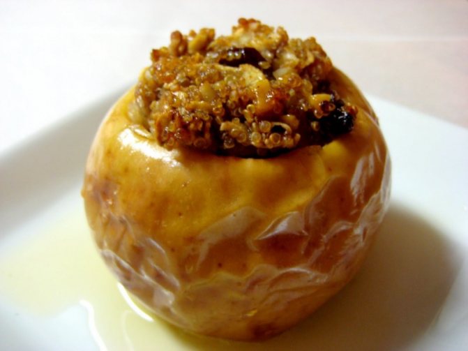 Начинить яблоки мелко нарезанной курагой, посыпать специями и полить мёдом. Запекать 15–20 минут. Есть горячими, запивая чаем с лимоном.