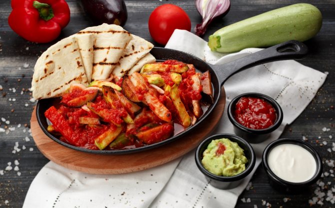 Фахитос относится к блюдам мексиканской кухни, и ему свойственны все ее основные черты: сочность, сытность, острота и пикантность, а также красочный и крайне аппетитный вид. В состав фахитос входят обжаренное на гриле или сковороде мясо, порезанное некрупными брусочками или соломкой, свежие и достаточно крупно порезанные овощи. Однако поданное в таком виде блюдо не будет полноценным фахитос. К нему обязательно нужно подать тортильи и соус, а лучше несколько соусов на выбор, чтобы каждый мог завернуть фахитос в тортилью самостоятельно, полив выбранным по своему вкусу соусом. Мясо можно заменить грибами, тогда фахитос будет вегетарианским. В таком случае и соусы для него нужно подбирать соответствующие.