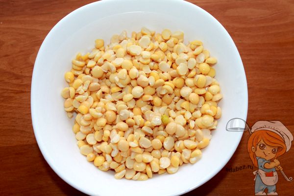 Горох берем сушеный колотый. Он быстрее набухает. Моем зерна, удалив грязь и мусор, в проточной воде до тех пор, пока она не станет прозрачной. Заливаем холодной водой и оставляем набухать на 10 часов.