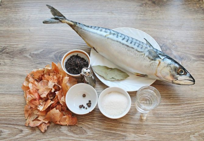 Ингредиенты : скумбрия – 2 шт.; литр воды; соль – 4 ст л.; сахар – 2 ст. л.; жидкий дым – 10 мл; шелуха от лука – пару горстей.