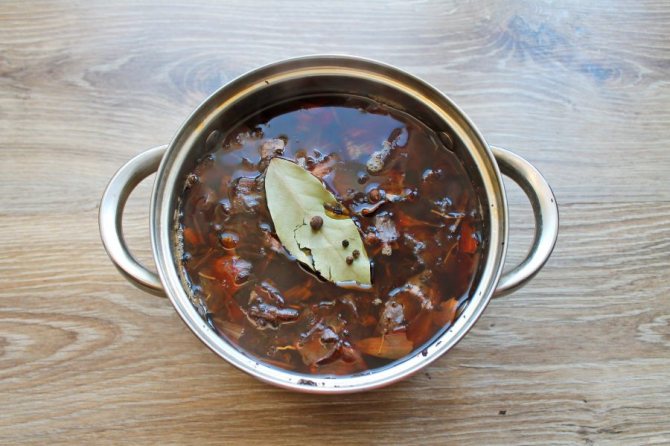 - Смешиваем стакан воды со всеми специями из рецепта, в том числе с маслом и уксусом. Можем добавить 3-4 ломтика лимона, 2-3 морковки, нарезанной полосками. Тщательно перемешиваем. Пикантная заливка готова.