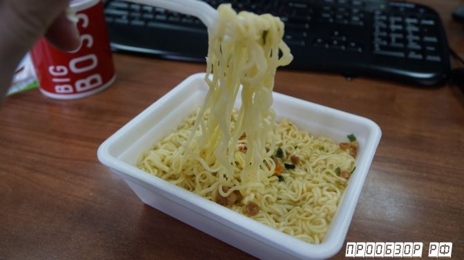 Довольно популярна среди отечественного покупателя и лапша «Биг-Бон». Достоинством продукта является довольно вкусный и сытный соус, а также полезная и ароматная овощная приправа.