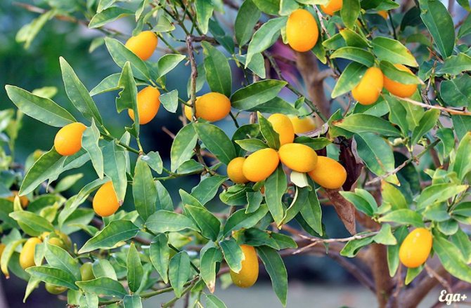 - Цитранжкват. Это гибридный сорт, который был выведен еще в начале XX столетия. Плоды обладают средним размером и овальной формой. Кожура оранжево-желтая. Плод с кислым привкусом. Внутри часто встречаются семена. На стволах могут быть шипы.