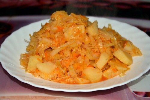Калорийность тушеной капусты с картошкой без обжаривания составляет 68 ккал на 100 г.