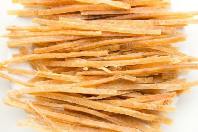 - Сушёная рыба чаще встречается в виде соломки к пиву. Плюс блюда — отсутствие термической обработки и сохранение полезных свойств. Минус — наличие соли и специй. Добавки вызывают раздражение слизистой желудка, задерживают жидкость в организме. Есть такого минтая можно 50 г 1–2 раза в неделю. Злоупотребление вызывает гастрит, панкреатит, язву желудка, проблемы в работе мочевыделительной системы.