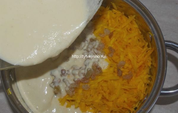 5. Переливаем к натертой тыкве манно-яичную смесь и все смешиваем.