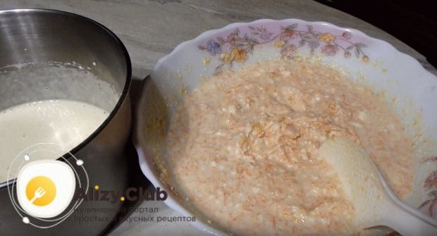 - Смешайте яичную смесь с тыквой, творогом и манкой.