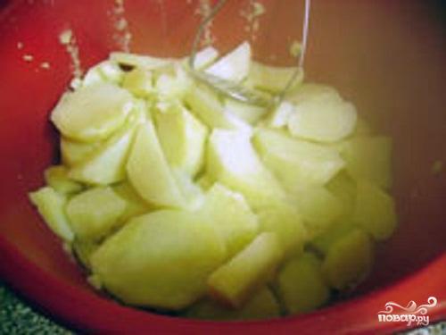 1. Картофель почистить, нарезать на произвольные куски и отварить в подсоленной воде до готовности. Слить отвар. Картофель переложить в отдельную посуду. При помощи толкушки хорошо размять картофель до однородной массы и дать немного остыть.