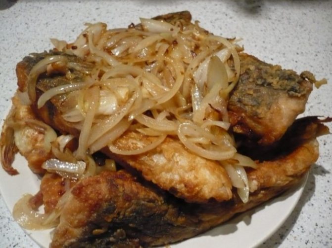 - Порезать кольцами лук, обжарить на сковороде на масле, а затем выложить на отдельную тарелку. Потом обвалять каждый кусочек рыбы в муке, отправить на сковороду с этим же маслом и обжарить до полуготовности с обеих сторон.
