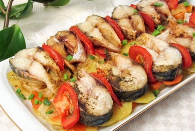 - Выложите рыбу на овальное блюдо, разрежьте порционными кусочками и подайте к столу, украсив зеленью, дольками лимона или помидора.