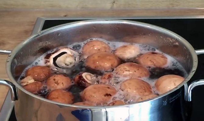 - С момента закипания засекаем примерно пять минут, чего достаточно для размягчения продукта, его термообработки, после которой шампиньоны можно было бы употреблять.