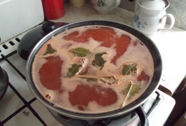 - Из мягких помидоров варится сок или к уже готовому продукту добавляются сахар, соль, специи, уксус и все вместе кипятят 8-10 минут.