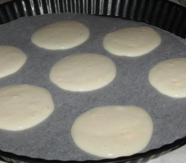 Разогрейте духовку до 230 градусов. На противень выложите пергаментную бумагу или смажьте его растительным маслом, чтобы коржи не пристали. Выложите тесто ложкой на бумагу в форме небольших блинчиков или лепешек. Можно отсадить тесто кондитерским мешком. Оставляйте между кружками теста расстояние, так как оно поднимется в духовке.
